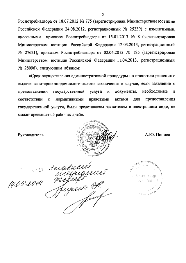 "О ВНЕСЕНИИ ИЗМЕНЕНИЙ В АДМИНИСТРАТИВНЫЙ РЕГЛАМЕНТ ФЕДЕРАЛЬНОЙ СЛУЖБЫ ПО НАДЗОРУ В СФЕРЕ ЗАЩИТЫ ПРАВ ПОТРЕБИТЕЛЕЙ И БЛАГОПОЛУЧИЯ ЧЕЛОВЕКА ПО ПРЕДОСТАВЛЕНИЮ ГОСУДАРСТВЕННОЙ УСЛУГИ ПО ВЫДАЧЕ НА ОСНОВАНИИ РЕЗУЛЬТАТОВ САНИТАРНО - ЭПИДЕМИОЛОГИЧЕСКИХ ЭКСПЕРТИЗ, РАССЛЕДОВАНИЙ, ОБСЛЕДОВАНИЙ, ИССЛЕДОВАНИЙ, ИСПЫТАНИЙ И ИНЫХ ВИДОВ ОЦЕНОК, ОФОРМЛЕННЫХ В УСТАНОВЛЕННОМ ПОРЯДКЕ, САНИТАРНО - ЭПИДЕМИОЛОГИЧЕСКИХ ЗАКЛЮЧЕНИЙ, УТВЕРЖДЕННЫЙ ПРИКАЗОМ РОСПОТРЕБНАДЗОРА ОТ 18.07.2012 N 775"