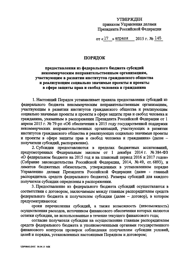 ПРИКАЗ Управления делами Президента РФ от 17.04.2015 N 145