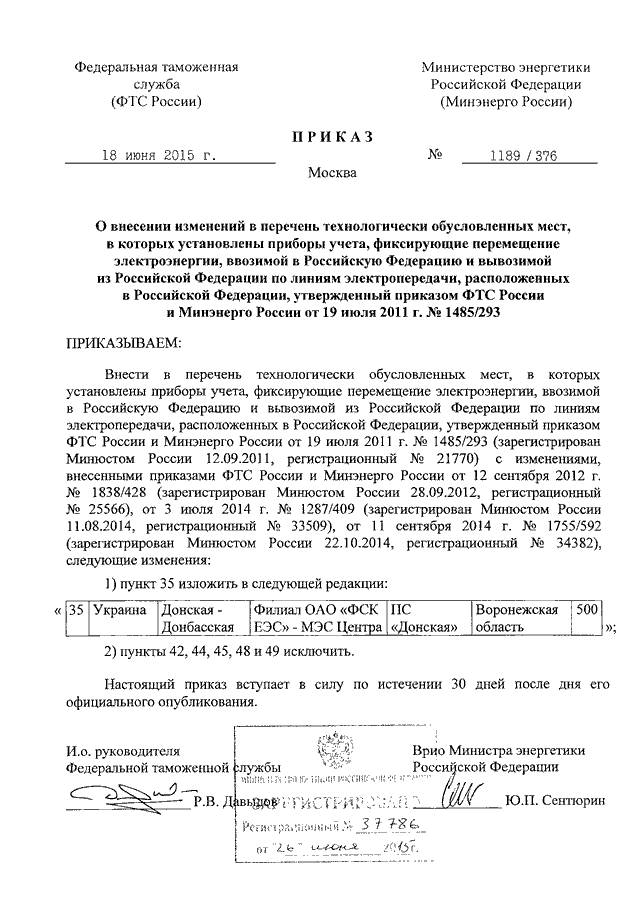 ПРИКАЗ ФТС РФ N 1189, Минэнерго РФ N 376 от 18.06.2015