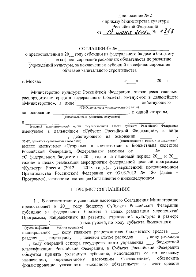 "ОБ УТВЕРЖДЕНИИ ФОРМЫ ЗАЯВКИ О ПЕРЕЧИСЛЕНИИ СУБСИДИИ ИЗ ФЕДЕРАЛЬНОГО БЮДЖЕТА БЮДЖЕТУ СУБЪЕКТА РОССИЙСКОЙ ФЕДЕРАЦИИ НА СОФИНАНСИРОВАНИЕ РАСХОДНЫХ ОБЯЗАТЕЛЬСТВ СУБЪЕКТА РОССИЙСКОЙ ФЕДЕРАЦИИ ПО РАЗВИТИЮ УЧРЕЖДЕНИЙ КУЛЬТУРЫ, ЗА ИСКЛЮЧЕНИЕМ СУБСИДИИ НА СОФИНАНСИРОВАНИЕ ОБЪЕКТОВ КАПИТАЛЬНОГО СТРОИТЕЛЬСТВА, И ФОРМЫ СОГЛАШЕНИЯ МЕЖДУ МИНИСТЕРСТВОМ КУЛЬТУРЫ РОССИЙСКОЙ ФЕДЕРАЦИИ И СУБЪЕКТОМ РОССИЙСКОЙ ФЕДЕРАЦИИ О ПРЕДОСТАВЛЕНИИ СУБСИДИИ ИЗ ФЕДЕРАЛЬНОГО БЮДЖЕТА БЮДЖЕТУ СУБЪЕКТА РОССИЙСКОЙ ФЕДЕРАЦИИ НА СОФИНАНСИРОВАНИЕ РАСХОДНЫХ ОБЯЗАТЕЛЬСТВ СУБЪЕКТА РОССИЙСКОЙ ФЕДЕРАЦИИ ПО РАЗВИТИЮ УЧРЕЖДЕНИЙ КУЛЬТУРЫ, ЗА ИСКЛЮЧЕНИЕМ СУБСИДИИ НА СОФИНАНСИРОВАНИЕ ОБЪЕКТОВ КАПИТАЛЬНОГО СТРОИТЕЛЬСТВА"
