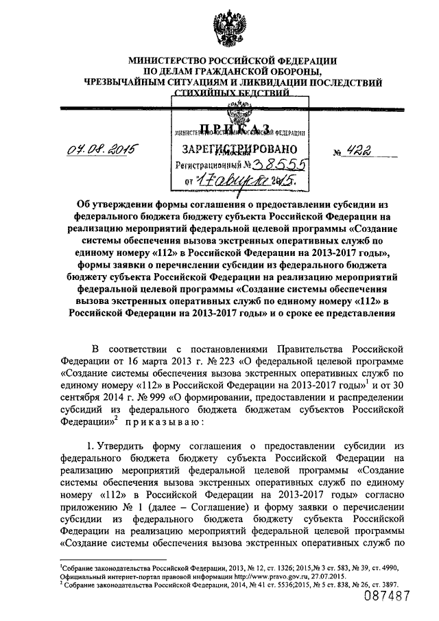 ПРИКАЗ МЧС РФ от 07.08.2015 N 422