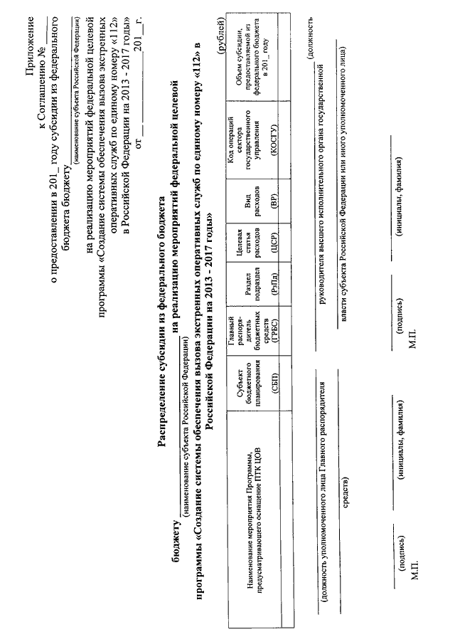 "ОБ УТВЕРЖДЕНИИ ФОРМЫ СОГЛАШЕНИЯ О ПРЕДОСТАВЛЕНИИ СУБСИДИИ ИЗ ФЕДЕРАЛЬНОГО БЮДЖЕТА БЮДЖЕТУ СУБЪЕКТА РОССИЙСКОЙ ФЕДЕРАЦИИ НА РЕАЛИЗАЦИЮ МЕРОПРИЯТИЙ ФЕДЕРАЛЬНОЙ ЦЕЛЕВОЙ ПРОГРАММЫ "СОЗДАНИЕ СИСТЕМЫ ОБЕСПЕЧЕНИЯ ВЫЗОВА ЭКСТРЕННЫХ ОПЕРАТИВНЫХ СЛУЖБ ПО ЕДИНОМУ НОМЕРУ "112" В РОССИЙСКОЙ ФЕДЕРАЦИИ НА 2013 - 2017 ГОДЫ", ФОРМЫ ЗАЯВКИ О ПЕРЕЧИСЛЕНИИ СУБСИДИИ ИЗ ФЕДЕРАЛЬНОГО БЮДЖЕТА БЮДЖЕТУ СУБЪЕКТА РОССИЙСКОЙ ФЕДЕРАЦИИ НА РЕАЛИЗАЦИЮ МЕРОПРИЯТИЙ ФЕДЕРАЛЬНОЙ ЦЕЛЕВОЙ ПРОГРАММЫ "СОЗДАНИЕ СИСТЕМЫ ОБЕСПЕЧЕНИЯ ВЫЗОВА ЭКСТРЕННЫХ ОПЕРАТИВНЫХ СЛУЖБ ПО ЕДИНОМУ НОМЕРУ "112" В РОССИЙСКОЙ ФЕДЕРАЦИИ НА 2013 - 2017 ГОДЫ" И О СРОКЕ ЕЕ ПРЕДСТАВЛЕНИЯ"