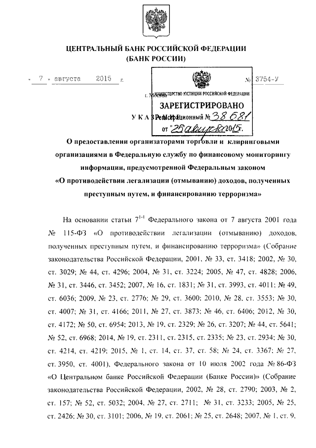 УКАЗАНИЕ ЦБ РФ от 07.08.2015 N 3754-У