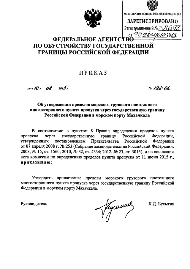ПРИКАЗ Росграницы от 10.08.2015 N 192-ОД