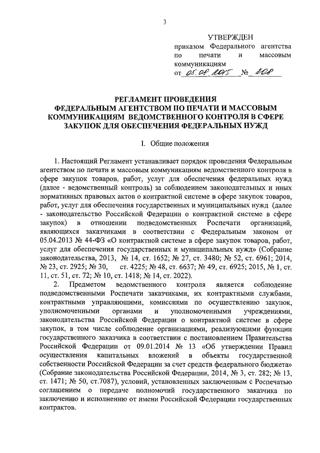 "ОБ УТВЕРЖДЕНИИ РЕГЛАМЕНТА ПРОВЕДЕНИЯ ФЕДЕРАЛЬНЫМ АГЕНТСТВОМ ПО ПЕЧАТИ И МАССОВЫМ КОММУНИКАЦИЯМ ВЕДОМСТВЕННОГО КОНТРОЛЯ В СФЕРЕ ЗАКУПОК ДЛЯ ОБЕСПЕЧЕНИЯ ФЕДЕРАЛЬНЫХ НУЖД"