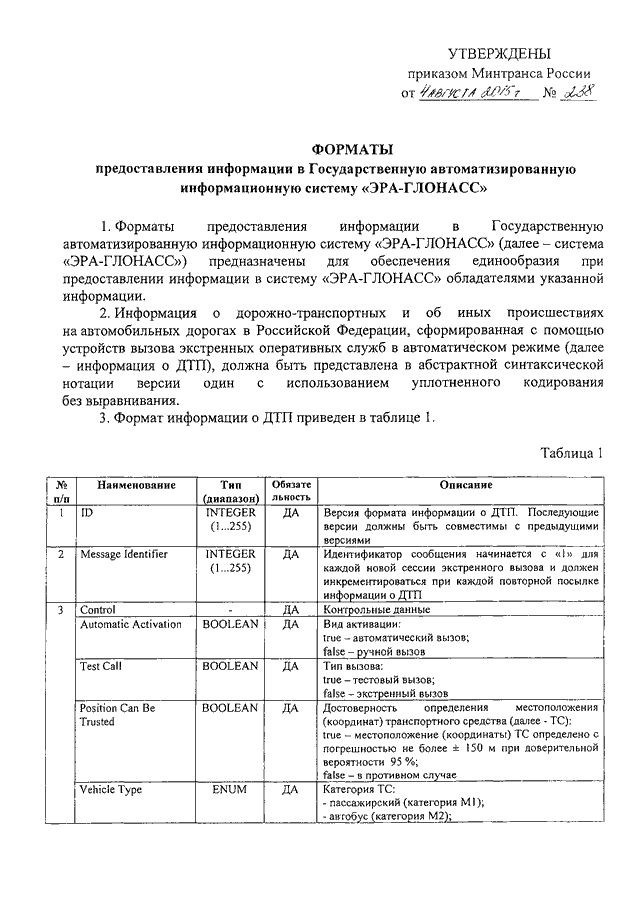"ОБ УТВЕРЖДЕНИИ ФОРМАТОВ ПРЕДОСТАВЛЕНИЯ ИНФОРМАЦИИ В ГОСУДАРСТВЕННУЮ АВТОМАТИЗИРОВАННУЮ ИНФОРМАЦИОННУЮ СИСТЕМУ "ЭРА-ГЛОНАСС"