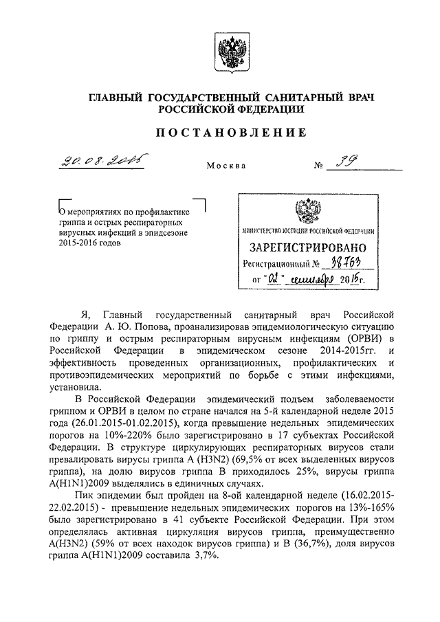 ПОСТАНОВЛЕНИЕ Главного государственного санитарного врача РФ от 20.08.2015 N 39