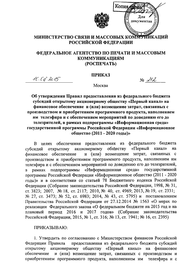 СУБСИДИЙ ОТКРЫТОМУ АКЦИОНЕРНОМУ ОБЩЕСТВУ "ПЕРВЫЙ КАНАЛ" НА