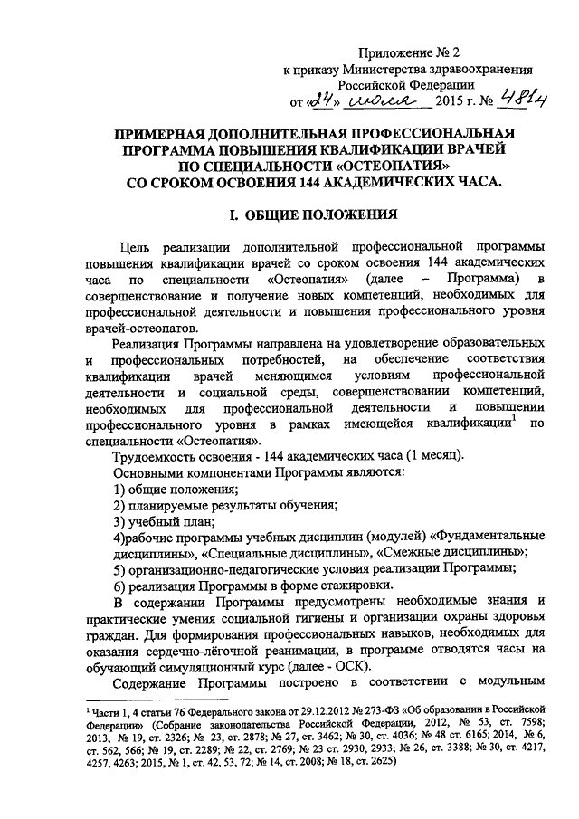 "ОБ УТВЕРЖДЕНИИ ПРИМЕРНЫХ ДОПОЛНИТЕЛЬНЫХ ПРОФЕССИОНАЛЬНЫХ ПРОГРАММ МЕДИЦИНСКОГО ОБРАЗОВАНИЯ ПО СПЕЦИАЛЬНОСТИ "ОСТЕОПАТИЯ"