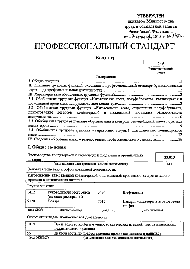 "ОБ УТВЕРЖДЕНИИ ПРОФЕССИОНАЛЬНОГО СТАНДАРТА "КОНДИТЕР"
