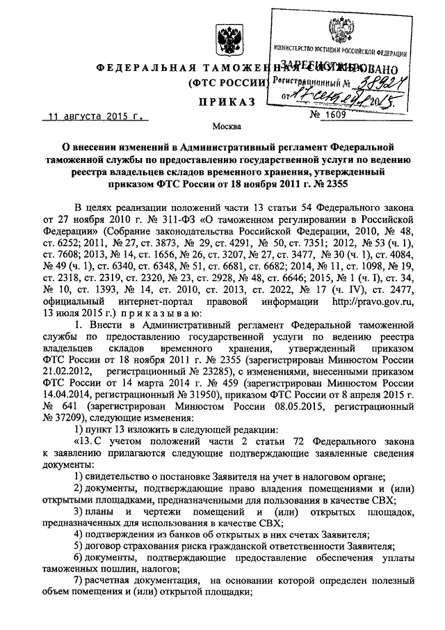 ПРИКАЗ ФТС РФ от 11.08.2015 N 1609