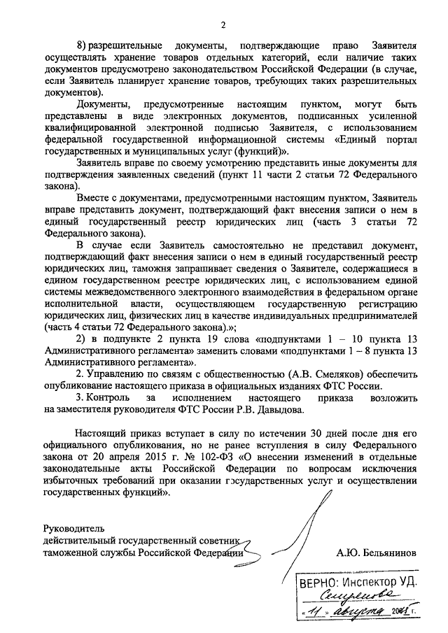 ПРИКАЗ ФТС РФ от 11.08.2015 N 1609