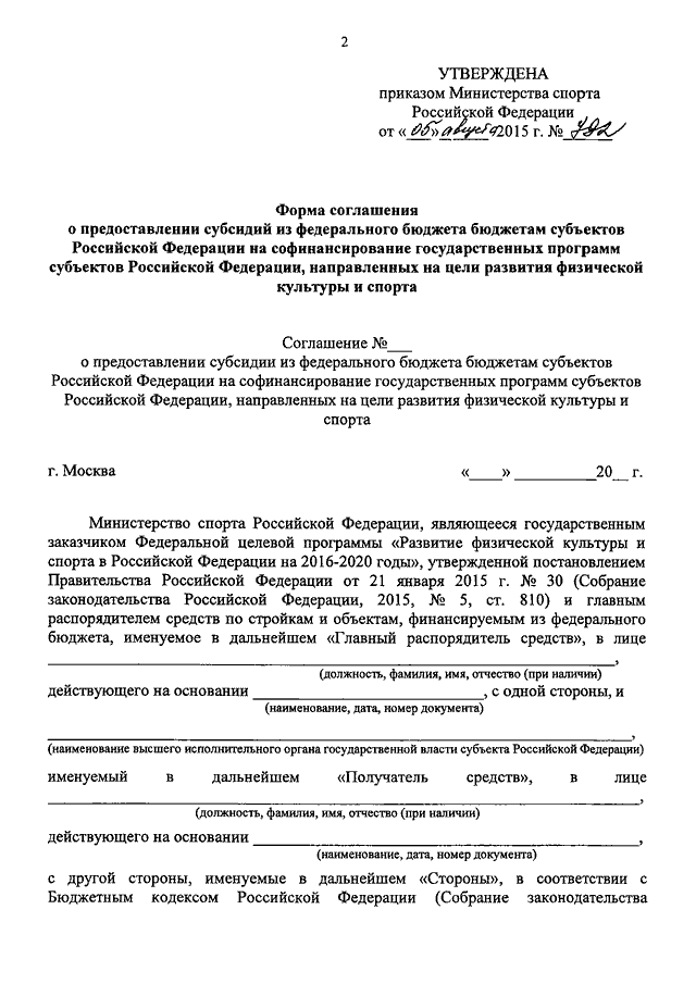 "ОБ УТВЕРЖДЕНИИ ФОРМЫ СОГЛАШЕНИЯ О ПРЕДОСТАВЛЕНИИ СУБСИДИЙ ИЗ ФЕДЕРАЛЬНОГО БЮДЖЕТА БЮДЖЕТАМ СУБЪЕКТОВ РОССИЙСКОЙ ФЕДЕРАЦИИ НА СОФИНАНСИРОВАНИЕ ГОСУДАРСТВЕННЫХ ПРОГРАММ СУБЪЕКТОВ РОССИЙСКОЙ ФЕДЕРАЦИИ, НАПРАВЛЕННЫХ НА ЦЕЛИ РАЗВИТИЯ ФИЗИЧЕСКОЙ КУЛЬТУРЫ И СПОРТА"