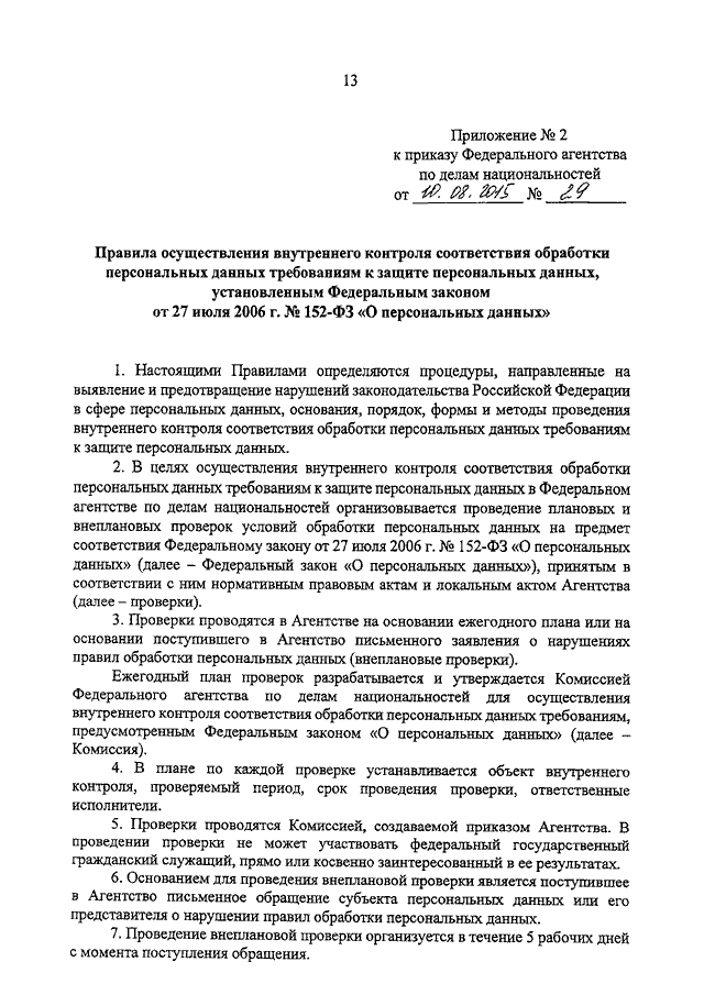(вместе с "ПРАВИЛАМИ ОБРАБОТКИ ПЕРСОНАЛЬНЫХ ДАННЫХ В ФЕДЕРАЛЬНОМ АГЕНТСТВЕ ПО ДЕЛАМ НАЦИОНАЛЬНОСТЕЙ", "ПРАВИЛАМИ ОСУЩЕСТВЛЕНИЯ ВНУТРЕННЕГО КОНТРОЛЯ СООТВЕТСТВИЯ ОБРАБОТКИ ПЕРСОНАЛЬНЫХ ДАННЫХ ТРЕБОВАНИЯМ К ЗАЩИТЕ ПЕРСОНАЛЬНЫХ ДАННЫХ, УСТАНОВЛЕННЫМ ФЕДЕРАЛЬНЫМ ЗАКОНОМ ОТ 27 ИЮЛЯ 2006 Г. N 152-ФЗ "О ПЕРСОНАЛЬНЫХ ДАННЫХ") (Зарегистрировано в Минюсте РФ 09.10.2015 N 39269)