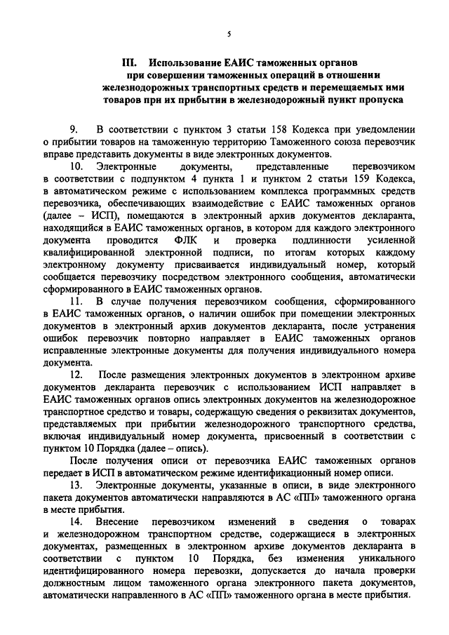 "ОБ УТВЕРЖДЕНИИ ПОРЯДКА ИСПОЛЬЗОВАНИЯ ЕДИНОЙ АВТОМАТИЗИРОВАННОЙ ИНФОРМАЦИОННОЙ СИСТЕМЫ ТАМОЖЕННЫХ ОРГАНОВ ПРИ СОВЕРШЕНИИ ТАМОЖЕННЫХ ОПЕРАЦИЙ В ОТНОШЕНИИ ЖЕЛЕЗНОДОРОЖНЫХ ТРАНСПОРТНЫХ СРЕДСТВ И ПЕРЕМЕЩАЕМЫХ ИМИ ТОВАРОВ В МЕЖДУНАРОДНОМ ГРУЗОВОМ СООБЩЕНИИ ПРИ ПРЕДСТАВЛЕНИИ ДОКУМЕНТОВ И СВЕДЕНИЙ В ЭЛЕКТРОННОМ ВИДЕ"