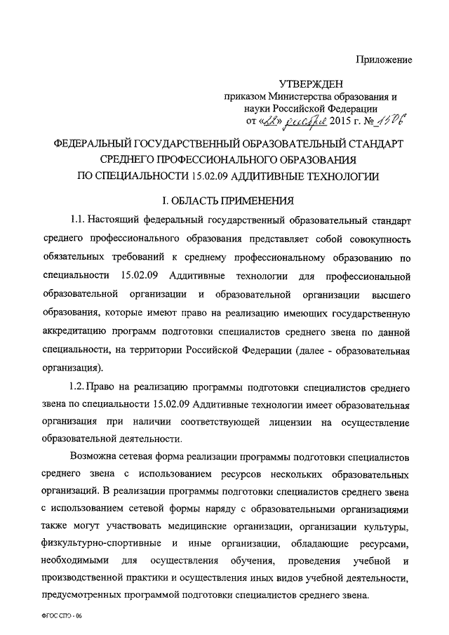 "ОБ УТВЕРЖДЕНИИ ФЕДЕРАЛЬНОГО ГОСУДАРСТВЕННОГО ОБРАЗОВАТЕЛЬНОГО СТАНДАРТА СРЕДНЕГО ПРОФЕССИОНАЛЬНОГО ОБРАЗОВАНИЯ ПО СПЕЦИАЛЬНОСТИ 15.02.09 АДДИТИВНЫЕ ТЕХНОЛОГИИ"