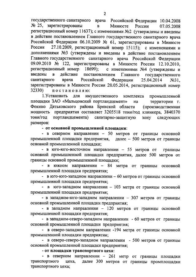 "ОБ УСТАНОВЛЕНИИ РАЗМЕРА САНИТАРНО - ЗАЩИТНОЙ ЗОНЫ ИМУЩЕСТВЕННОГО КОМПЛЕКСА ПРОМЫШЛЕННОЙ ПЛОЩАДКИ ЗАО "МАЛЬЦОВСКИЙ ПОРТЛАНДЦЕМЕНТ" НА ТЕРРИТОРИИ Г. ФОКИНО ДЯТЬКОВСКОГО РАЙОНА БРЯНСКОЙ ОБЛАСТИ"