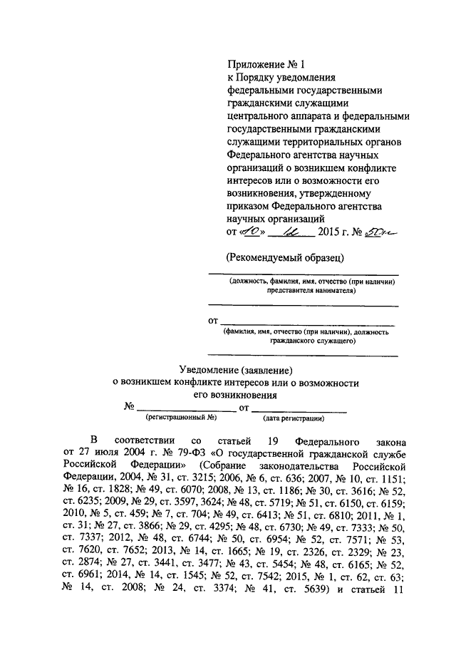 "ОБ УТВЕРЖДЕНИИ ПОРЯДКА УВЕДОМЛЕНИЯ ФЕДЕРАЛЬНЫМИ ГОСУДАРСТВЕННЫМИ ГРАЖДАНСКИМИ СЛУЖАЩИМИ ЦЕНТРАЛЬНОГО АППАРАТА И ФЕДЕРАЛЬНЫМИ ГОСУДАРСТВЕННЫМИ ГРАЖДАНСКИМИ СЛУЖАЩИМИ ТЕРРИТОРИАЛЬНЫХ ОРГАНОВ ФЕДЕРАЛЬНОГО АГЕНТСТВА НАУЧНЫХ ОРГАНИЗАЦИЙ О ВОЗНИКШЕМ КОНФЛИКТЕ ИНТЕРЕСОВ ИЛИ О ВОЗМОЖНОСТИ ЕГО ВОЗНИКНОВЕНИЯ"