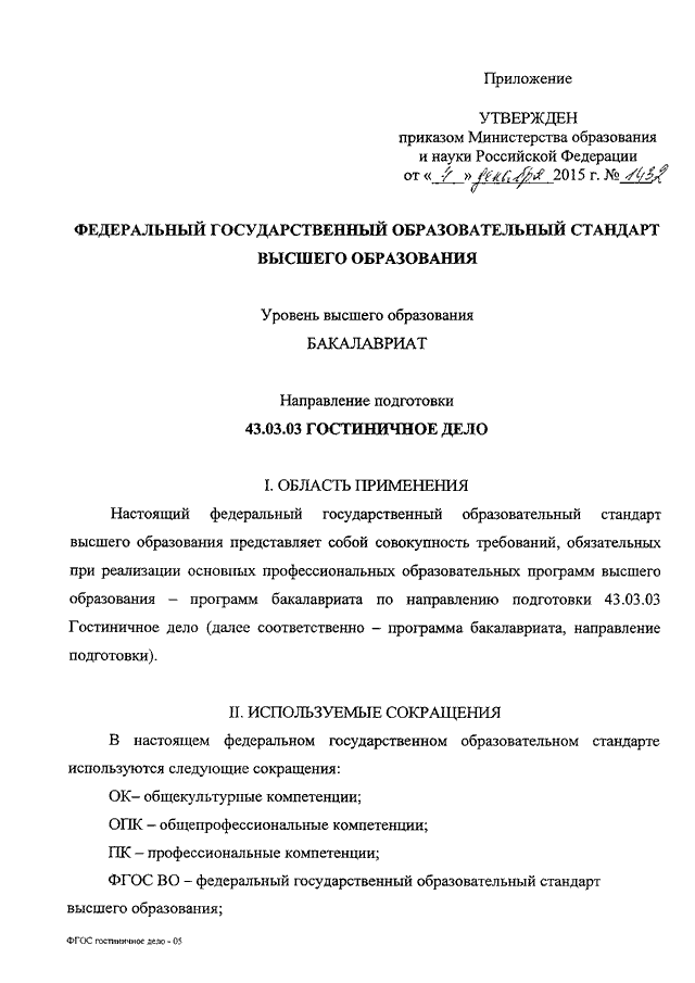 "ОБ УТВЕРЖДЕНИИ ФЕДЕРАЛЬНОГО ГОСУДАРСТВЕННОГО ОБРАЗОВАТЕЛЬНОГО СТАНДАРТА ВЫСШЕГО ОБРАЗОВАНИЯ ПО НАПРАВЛЕНИЮ ПОДГОТОВКИ 43.03.03 ГОСТИНИЧНОЕ ДЕЛО (УРОВЕНЬ БАКАЛАВРИАТА)"