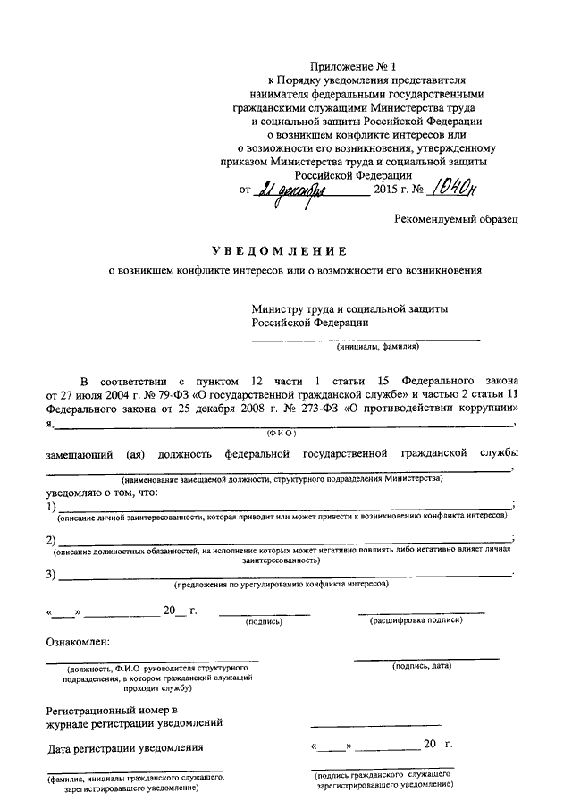 "ОБ УТВЕРЖДЕНИИ ПОРЯДКА УВЕДОМЛЕНИЯ ПРЕДСТАВИТЕЛЯ НАНИМАТЕЛЯ ФЕДЕРАЛЬНЫМИ ГОСУДАРСТВЕННЫМИ ГРАЖДАНСКИМИ СЛУЖАЩИМИ МИНИСТЕРСТВА ТРУДА И СОЦИАЛЬНОЙ ЗАЩИТЫ РОССИЙСКОЙ ФЕДЕРАЦИИ О ВОЗНИКШЕМ КОНФЛИКТЕ ИНТЕРЕСОВ ИЛИ О ВОЗМОЖНОСТИ ЕГО ВОЗНИКНОВЕНИЯ"