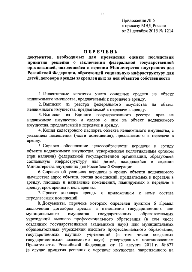 "ОБ УТВЕРЖДЕНИИ ПЕРЕЧНЕЙ ДОКУМЕНТОВ, НЕОБХОДИМЫХ ДЛЯ ПРОВЕДЕНИЯ ОЦЕНКИ ПОСЛЕДСТВИЙ ПРИНЯТИЯ РЕШЕНИЯ О РЕКОНСТРУКЦИИ, МОДЕРНИЗАЦИИ, ОБ ИЗМЕНЕНИИ НАЗНАЧЕНИЯ ИЛИ О ЛИКВИДАЦИИ ОБЪЕКТА СОЦИАЛЬНОЙ ИНФРАСТРУКТУРЫ ДЛЯ ДЕТЕЙ, ЯВЛЯЮЩЕГОСЯ ФЕДЕРАЛЬНОЙ ГОСУДАРСТВЕННОЙ СОБСТВЕННОСТЬЮ, ЗАКЛЮЧЕНИИ ФЕДЕРАЛЬНОЙ ГОСУДАРСТВЕННОЙ ОРГАНИЗАЦИЕЙ, НАХОДЯЩЕЙСЯ В ВЕДЕНИИ МИНИСТЕРСТВА ВНУТРЕННИХ ДЕЛ РОССИЙСКОЙ ФЕДЕРАЦИИ, ОБРАЗУЮЩЕЙ СОЦИАЛЬНУЮ ИНФРАСТРУКТУРУ ДЛЯ ДЕТЕЙ, ДОГОВОРА АРЕНДЫ ЗАКРЕПЛЕННЫХ ЗА НЕЙ ОБЪЕКТОВ СОБСТВЕННОСТИ"