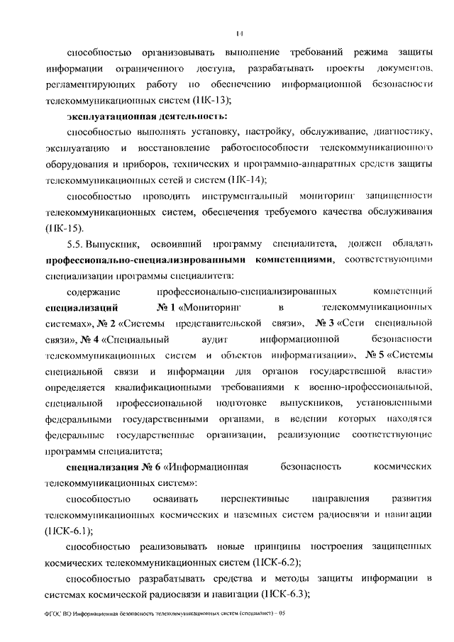 "ОБ УТВЕРЖДЕНИИ ФЕДЕРАЛЬНОГО ГОСУДАРСТВЕННОГО ОБРАЗОВАТЕЛЬНОГО СТАНДАРТА ВЫСШЕГО ОБРАЗОВАНИЯ ПО СПЕЦИАЛЬНОСТИ 10.05.02 ИНФОРМАЦИОННАЯ БЕЗОПАСНОСТЬ ТЕЛЕКОММУНИКАЦИОННЫХ СИСТЕМ (УРОВЕНЬ СПЕЦИАЛИСТА)"
