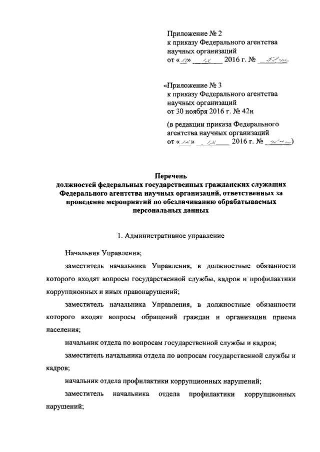 "О ВНЕСЕНИИ ИЗМЕНЕНИЙ В ПРИЛОЖЕНИЯ N 2 И N 3 К ПРИКАЗУ ФЕДЕРАЛЬНОГО АГЕНТСТВА НАУЧНЫХ ОРГАНИЗАЦИЙ ОТ 30 НОЯБРЯ 2015 Г. N 42Н "ОБ ОБРАБОТКЕ ПЕРСОНАЛЬНЫХ ДАННЫХ В ФЕДЕРАЛЬНОМ АГЕНТСТВЕ НАУЧНЫХ ОРГАНИЗАЦИЙ"