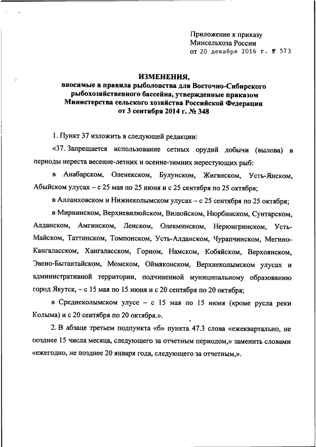 "О ВНЕСЕНИИ ИЗМЕНЕНИЙ В ПРАВИЛА РЫБОЛОВСТВА ДЛЯ ВОСТОЧНО - СИБИРСКОГО РЫБОХОЗЯЙСТВЕННОГО БАССЕЙНА, УТВЕРЖДЕННЫЕ ПРИКАЗОМ МИНИСТЕРСТВА СЕЛЬСКОГО ХОЗЯЙСТВА РОССИЙСКОЙ ФЕДЕРАЦИИ ОТ 3 СЕНТЯБРЯ 2014 Г. N 348"
