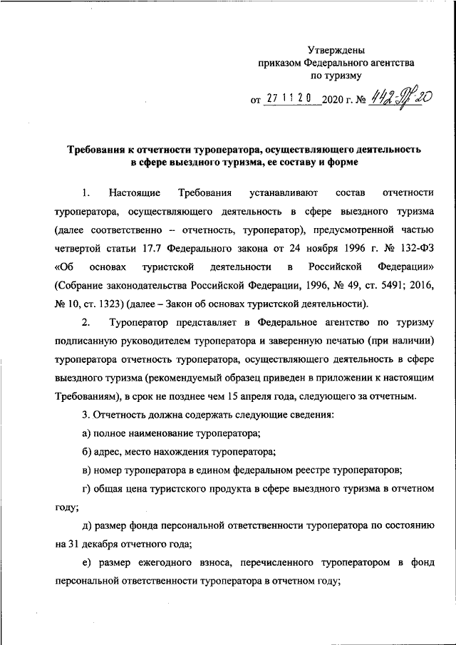 ПРИКАЗ Ростуризма от 27.11.2020 N 442-Пр-20