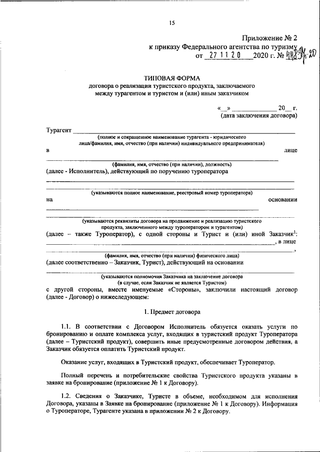 "ОБ УТВЕРЖДЕНИИ ТИПОВЫХ ФОРМ ДОГОВОРА О РЕАЛИЗАЦИИ ТУРИСТСКОГО ПРОДУКТА, ЗАКЛЮЧАЕМОГО МЕЖДУ ТУРОПЕРАТОРОМ И ТУРИСТОМ И (ИЛИ) ИНЫМ ЗАКАЗЧИКОМ, И ДОГОВОРА О РЕАЛИЗАЦИИ ТУРИСТСКОГО ПРОДУКТА, ЗАКЛЮЧАЕМОГО МЕЖДУ ТУРАГЕНТОМ И ТУРИСТОМ И (ИЛИ) ИНЫМ ЗАКАЗЧИКОМ"