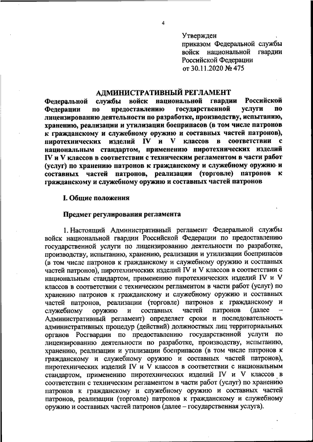 "ОБ УТВЕРЖДЕНИИ АДМИНИСТРАТИВНОГО РЕГЛАМЕНТА ФЕДЕРАЛЬНОЙ СЛУЖБЫ ВОЙСК НАЦИОНАЛЬНОЙ ГВАРДИИ РОССИЙСКОЙ ФЕДЕРАЦИИ ПО ПРЕДОСТАВЛЕНИЮ ГОСУДАРСТВЕННОЙ УСЛУГИ ПО ЛИЦЕНЗИРОВАНИЮ ДЕЯТЕЛЬНОСТИ ПО РАЗРАБОТКЕ, ПРОИЗВОДСТВУ, ИСПЫТАНИЮ, ХРАНЕНИЮ, РЕАЛИЗАЦИИ И УТИЛИЗАЦИИ БОЕПРИПАСОВ (В ТОМ ЧИСЛЕ ПАТРОНОВ К ГРАЖДАНСКОМУ И СЛУЖЕБНОМУ ОРУЖИЮ И СОСТАВНЫХ ЧАСТЕЙ ПАТРОНОВ), ПИРОТЕХНИЧЕСКИХ ИЗДЕЛИЙ IV И V КЛАССОВ В СООТВЕТСТВИИ С НАЦИОНАЛЬНЫМ СТАНДАРТОМ, ПРИМЕНЕНИЮ ПИРОТЕХНИЧЕСКИХ ИЗДЕЛИЙ IV И V КЛАССОВ В СООТВЕТСТВИИ С ТЕХНИЧЕСКИМ РЕГЛАМЕНТОМ В ЧАСТИ РАБОТ (УСЛУГ) ПО ХРАНЕНИЮ ПАТРОНОВ К ГРАЖДАНСКОМУ И СЛУЖЕБНОМУ ОРУЖИЮ И СОСТАВНЫХ ЧАСТЕЙ ПАТРОНОВ, РЕАЛИЗАЦИИ (ТОРГОВЛЕ) ПАТРОНОВ К ГРАЖДАНСКОМУ И СЛУЖЕБНОМУ ОРУЖИЮ И СОСТАВНЫХ ЧАСТЕЙ ПАТРОНОВ"