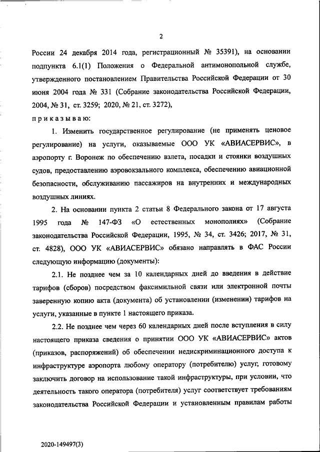 "ОБ ИЗМЕНЕНИИ ГОСУДАРСТВЕННОГО РЕГУЛИРОВАНИЯ НА УСЛУГИ В АЭРОПОРТУ Г. ВОРОНЕЖ, ОКАЗЫВАЕМЫЕ ООО УК "АВИАСЕРВИС"