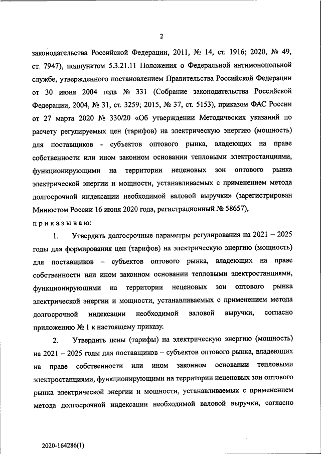 "ОБ УТВЕРЖДЕНИИ ЦЕН (ТАРИФОВ) НА ЭЛЕКТРИЧЕСКУЮ ЭНЕРГИЮ (МОЩНОСТЬ) ДЛЯ ПОСТАВЩИКОВ - СУБЪЕКТОВ ОПТОВОГО РЫНКА, ВЛАДЕЮЩИХ НА ПРАВЕ СОБСТВЕННОСТИ ИЛИ ИНОМ ЗАКОННОМ ОСНОВАНИИ ТЕПЛОВЫМИ ЭЛЕКТРОСТАНЦИЯМИ, ФУНКЦИОНИРУЮЩИМИ НА ТЕРРИТОРИИ НЕЦЕНОВЫХ ЗОН ОПТОВОГО РЫНКА ЭЛЕКТРИЧЕСКОЙ ЭНЕРГИИ И МОЩНОСТИ, УСТАНАВЛИВАЕМЫХ С ПРИМЕНЕНИЕМ МЕТОДА ДОЛГОСРОЧНОЙ ИНДЕКСАЦИИ НЕОБХОДИМОЙ ВАЛОВОЙ ВЫРУЧКИ НА 2021 - 2025 ГОДЫ"