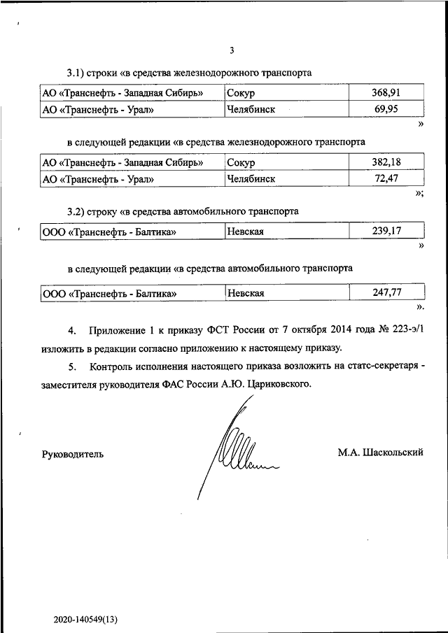 N 223-Э/1 "ОБ УТВЕРЖДЕНИИ ТАРИФОВ НА УСЛУГИ ПАО "ТРАНСНЕФТЬ" И ЕГО