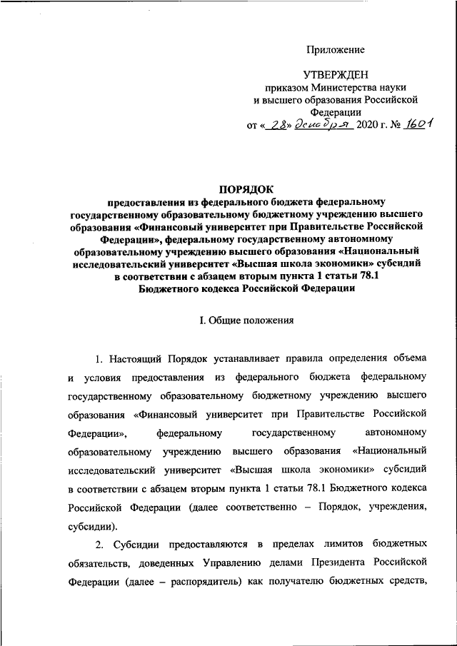 ПРИКАЗ Минобрнауки РФ от 28.12.2020 N 1601