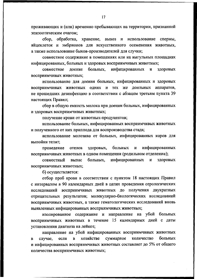 "ОБ УТВЕРЖДЕНИИ ВЕТЕРИНАРНЫХ ПРАВИЛ ОСУЩЕСТВЛЕНИЯ ПРОФИЛАКТИЧЕСКИХ, ДИАГНОСТИЧЕСКИХ, ОГРАНИЧИТЕЛЬНЫХ И ИНЫХ МЕРОПРИЯТИЙ, УСТАНОВЛЕНИЯ И ОТМЕНЫ КАРАНТИНА И ИНЫХ ОГРАНИЧЕНИЙ, НАПРАВЛЕННЫХ НА ПРЕДОТВРАЩЕНИЕ РАСПРОСТРАНЕНИЯ И ЛИКВИДАЦИЮ ОЧАГОВ ЛЕЙКОЗА КРУПНОГО РОГАТОГО СКОТА"