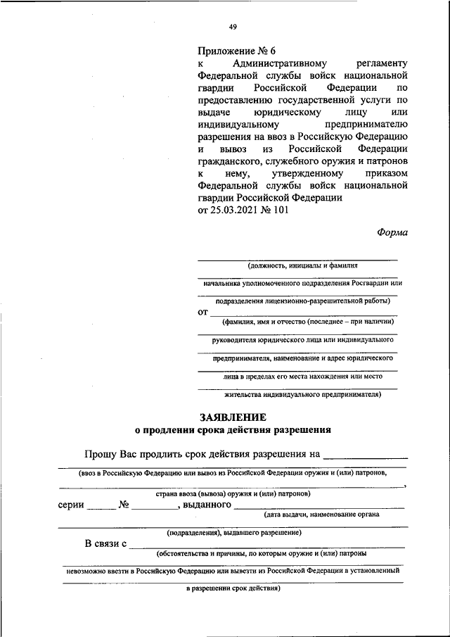 "ОБ УТВЕРЖДЕНИИ АДМИНИСТРАТИВНОГО РЕГЛАМЕНТА ФЕДЕРАЛЬНОЙ СЛУЖБЫ ВОЙСК НАЦИОНАЛЬНОЙ ГВАРДИИ РОССИЙСКОЙ ФЕДЕРАЦИИ ПО ПРЕДОСТАВЛЕНИЮ ГОСУДАРСТВЕННОЙ УСЛУГИ ПО ВЫДАЧЕ ЮРИДИЧЕСКОМУ ЛИЦУ ИЛИ ИНДИВИДУАЛЬНОМУ ПРЕДПРИНИМАТЕЛЮ РАЗРЕШЕНИЯ НА ВВОЗ В РОССИЙСКУЮ ФЕДЕРАЦИЮ И ВЫВОЗ ИЗ РОССИЙСКОЙ ФЕДЕРАЦИИ ГРАЖДАНСКОГО, СЛУЖЕБНОГО ОРУЖИЯ И ПАТРОНОВ К НЕМУ"