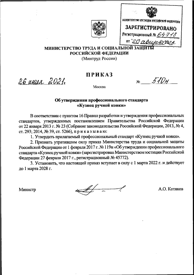 ПРИКАЗ Минтруда РФ от 26.07.2021 N 510н