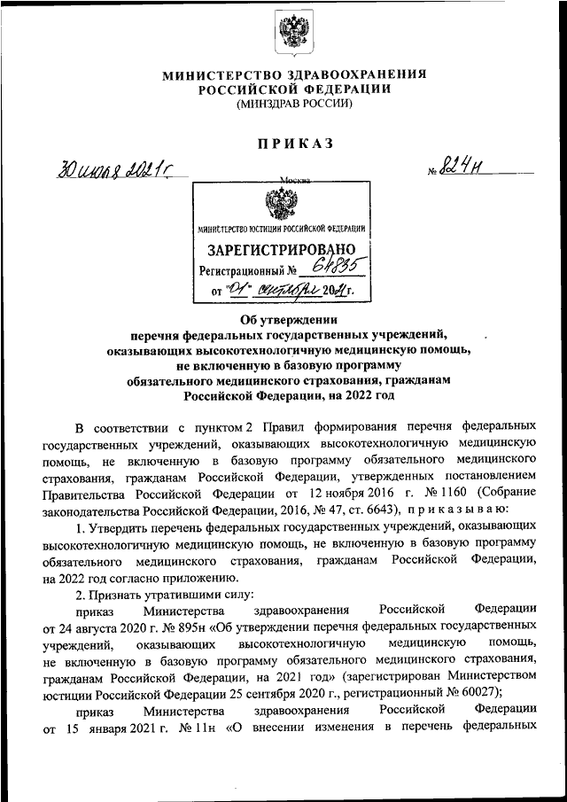 ПРИКАЗ Минздрава РФ от 30.07.2021 N 824н
