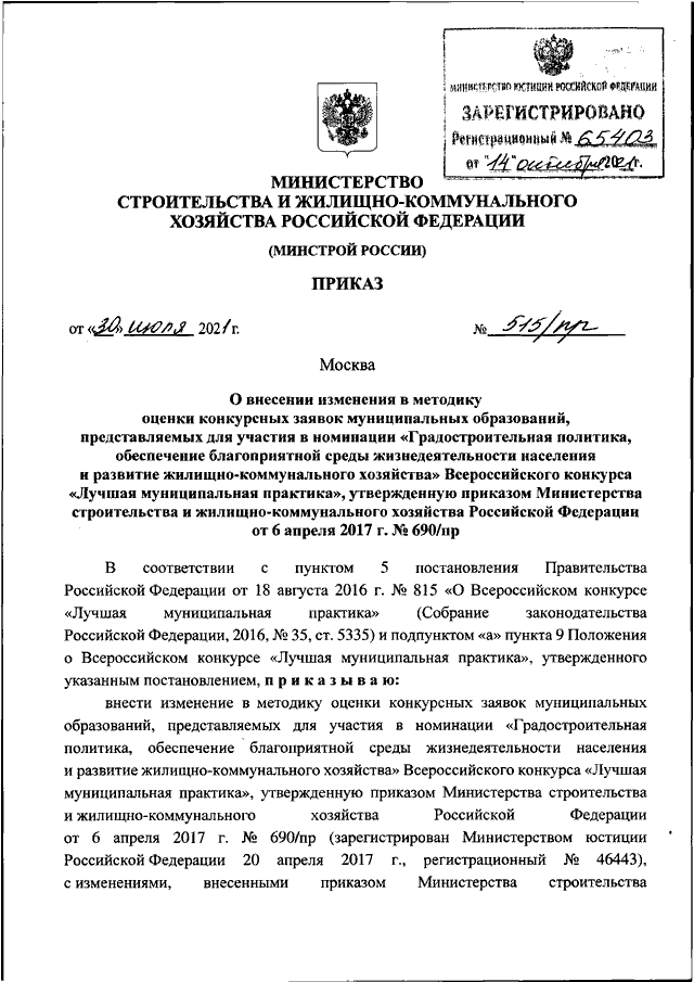 ПРИКАЗ Минстроя РФ от 30.07.2021 N 515/пр