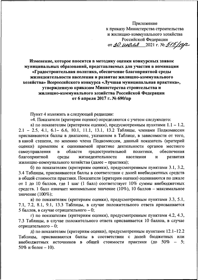 "О ВНЕСЕНИИ ИЗМЕНЕНИЯ В МЕТОДИКУ ОЦЕНКИ КОНКУРСНЫХ ЗАЯВОК МУНИЦИПАЛЬНЫХ ОБРАЗОВАНИЙ, ПРЕДСТАВЛЯЕМЫХ ДЛЯ УЧАСТИЯ В НОМИНАЦИИ "ГРАДОСТРОИТЕЛЬНАЯ ПОЛИТИКА, ОБЕСПЕЧЕНИЕ БЛАГОПРИЯТНОЙ СРЕДЫ ЖИЗНЕДЕЯТЕЛЬНОСТИ НАСЕЛЕНИЯ И РАЗВИТИЕ ЖИЛИЩНО - КОММУНАЛЬНОГО ХОЗЯЙСТВА" ВСЕРОССИЙСКОГО КОНКУРСА "ЛУЧШАЯ МУНИЦИПАЛЬНАЯ ПРАКТИКА", УТВЕРЖДЕННУЮ ПРИКАЗОМ МИНИСТЕРСТВА СТРОИТЕЛЬСТВА И ЖИЛИЩНО - КОММУНАЛЬНОГО ХОЗЯЙСТВА РОССИЙСКОЙ ФЕДЕРАЦИИ ОТ 6 АПРЕЛЯ 2017 Г. N 690/ПР"