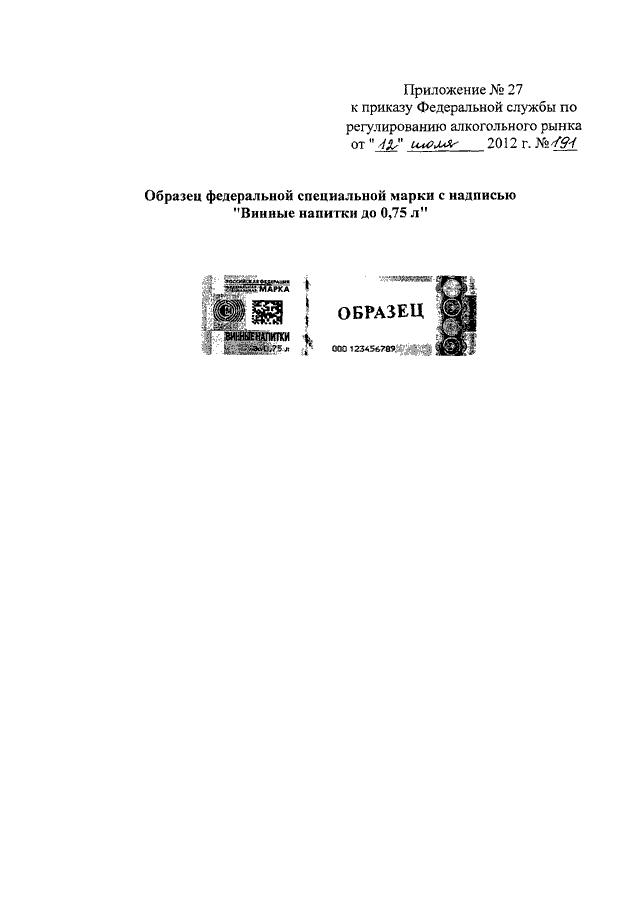 ПРИКАЗ Росалкогольрегулирования от 12.07.2012 N 191