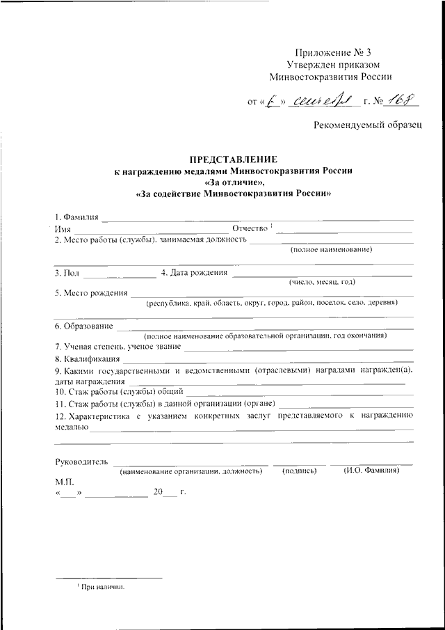 ПРИКАЗ Минвостокразвития РФ от 06.09.2021 N 168
