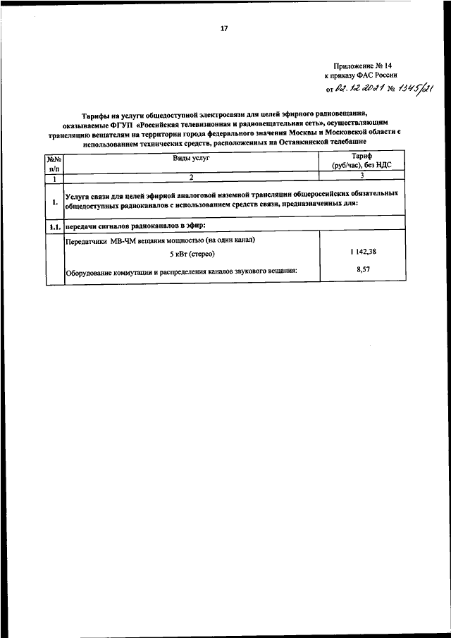 "ОБ УТВЕРЖДЕНИИ ТАРИФОВ НА УСЛУГИ ОБЩЕДОСТУПНОЙ ЭЛЕКТРОСВЯЗИ ДЛЯ ЦЕЛЕЙ ЭФИРНОГО ТЕЛЕВИЗИОННОГО ВЕЩАНИЯ И (ИЛИ) РАДИОВЕЩАНИЯ, ОКАЗЫВАЕМЫЕ ФГУП "РОССИЙСКАЯ ТЕЛЕВИЗИОННАЯ И РАДИОВЕЩАТЕЛЬНАЯ СЕТЬ", ОСУЩЕСТВЛЯЮЩИМ ТРАНСЛЯЦИЮ ВЕЩАТЕЛЯМ"