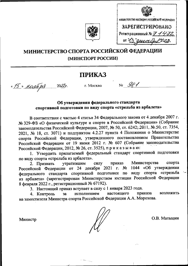 ПРИКАЗ Минспорта РФ от 15.11.2022 N 981