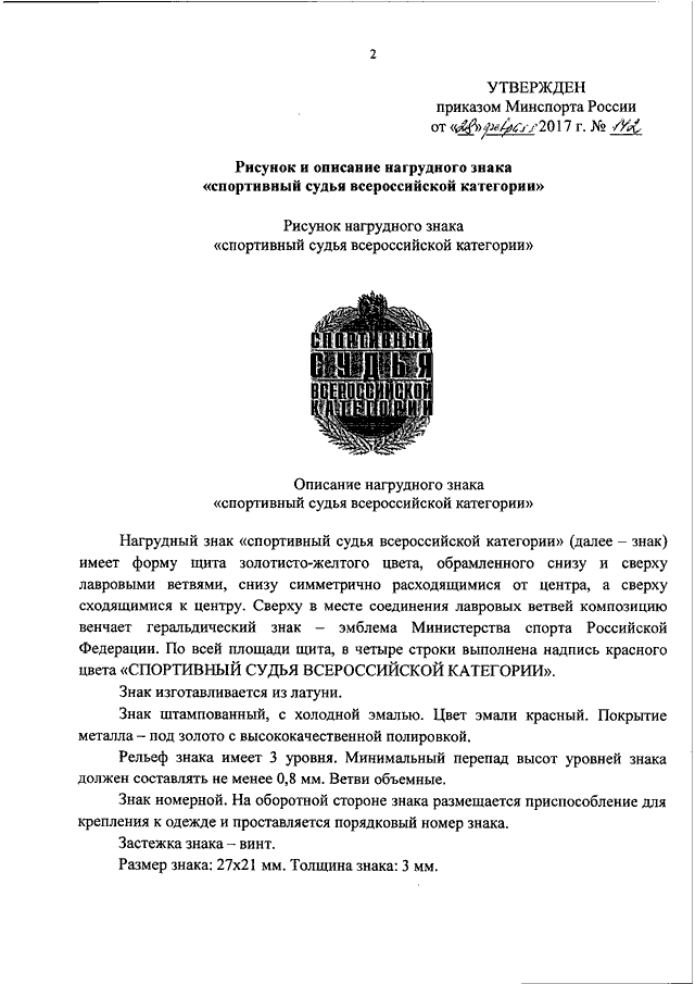 "ОБ УТВЕРЖДЕНИИ РИСУНКА И ОПИСАНИЯ НАГРУДНОГО ЗНАКА "СПОРТИВНЫЙ СУДЬЯ ВСЕРОССИЙСКОЙ КАТЕГОРИИ"