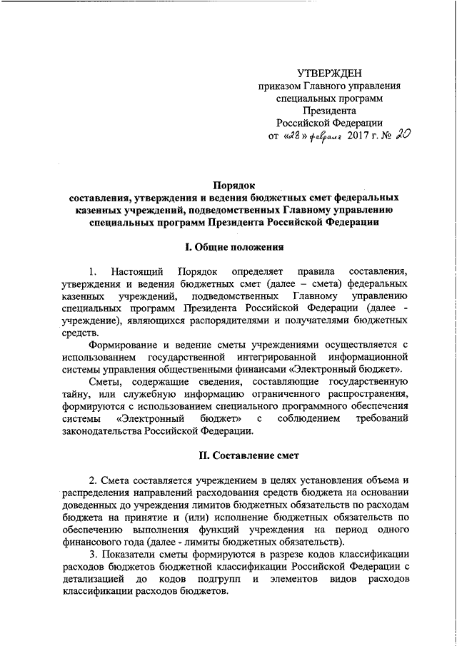 ПРИКАЗ ГУСП от 28.02.2017 N 20