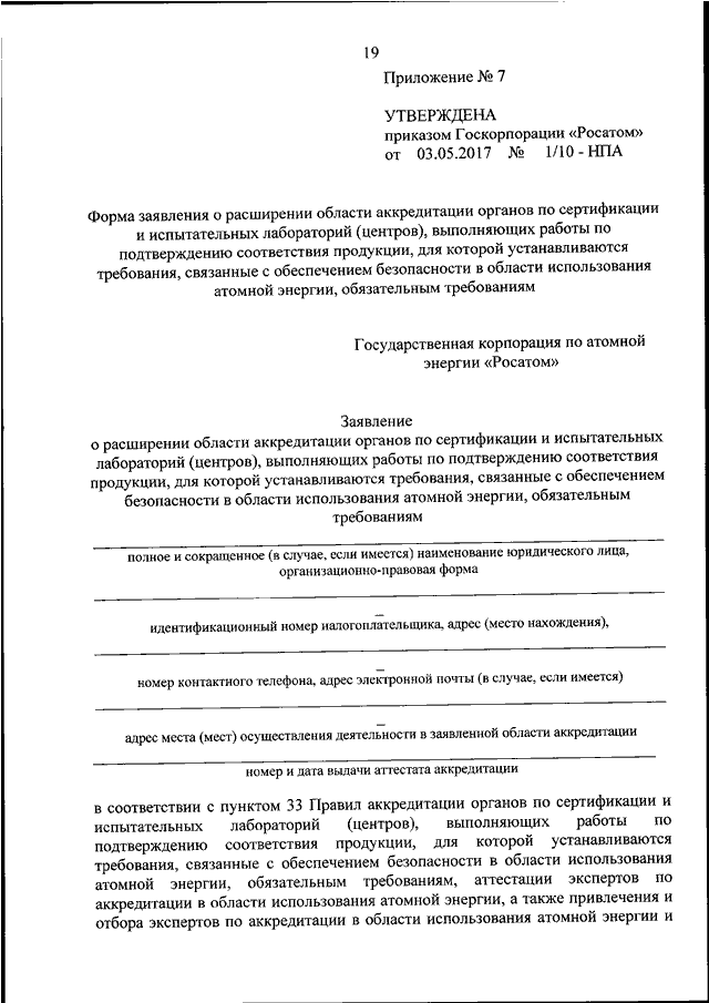 "Росатом" от 03.05.2017 N 1/10-НПА "ОБ УТВЕРЖДЕНИИ ФОРМЫ АТТЕСТАТА АККРЕДИТАЦИИ ОРГАНА ПО СЕРТИФИКАЦИИ, ИСПЫТАТЕЛЬНОЙ ЛАБОРАТОРИИ (ЦЕНТРА), ВЫПОЛНЯЮЩИХ РАБОТЫ ПО ПОДТВЕРЖДЕНИЮ СООТВЕТСТВИЯ ПРОДУКЦИИ, ДЛЯ КОТОРОЙ УСТАНАВЛИВАЮТСЯ ТРЕБОВАНИЯ, СВЯЗАННЫЕ С ОБЕСПЕЧЕНИЕМ БЕЗОПАСНОСТИ В ОБЛАСТИ ИСПОЛЬЗОВАНИЯ АТОМНОЙ ЭНЕРГИИ, ОБЯЗАТЕЛЬНЫМ ТРЕБОВАНИЯМ И ФОРМ ПРИЛОЖЕНИЙ К НЕМУ, ФОРМЫ РЕШЕНИЯ ОРГАНА ПО АККРЕДИТАЦИИ О ПРОВЕДЕНИИ ОЦЕНКИ СООТВЕТСТВИЯ ЗАЯВИТЕЛЯ КРИТЕРИЯМ АККРЕДИТАЦИИ ОРГАНОВ ПО СЕРТИФИКАЦИИ И ИСПЫТАТЕЛЬНЫХ ЛАБОРАТОРИЙ (ЦЕНТРОВ), ВЫПОЛНЯЮЩИХ РАБОТЫ ПО ПОДТВЕРЖДЕНИЮ СООТВЕТСТВИЯ ПРОДУКЦИИ, ДЛЯ КОТОРОЙ УСТАНАВЛИВАЮТСЯ ТРЕБОВАНИЯ, СВЯЗАННЫЕ С ОБЕСПЕЧЕНИЕМ БЕЗОПАСНОСТИ В ОБЛАСТИ ИСПОЛЬЗОВАНИЯ АТОМНОЙ ЭНЕРГИИ, ОБЯЗАТЕЛЬНЫМ ТРЕБОВАНИЯМ, И ФОРМ ЗАЯВЛЕНИЙ, ПОДАВАЕМЫХ ЮРИДИЧЕСКИМИ ЛИЦАМИ, ПРЕТЕНДУЮЩИМИ НА АККРЕДИТАЦИЮ В КАЧЕСТВЕ ОРГАНА ПО СЕРТИФИКАЦИИ, ИСПЫТАТЕЛЬНОЙ ЛАБОРАТОРИИ (ЦЕНТРА), И ОРГАНАМИ ПО СЕРТИФИКАЦИИ И ИСПЫТАТЕЛЬНЫМИ ЛАБОРАТОРИЯМИ (ЦЕНТРАМИ), ВЫПОЛНЯЮЩИМИ РАБОТЫ ПО ПОДТВЕРЖДЕНИЮ СООТВЕТСТВИЯ ПРОДУКЦИИ, ДЛЯ КОТОРОЙ УСТАНАВЛИВАЮТСЯ ТРЕБОВАНИЯ, СВЯЗАННЫЕ С ОБЕСПЕЧЕНИЕМ БЕЗОПАСНОСТИ В ОБЛАСТИ ИСПОЛЬЗОВАНИЯ АТОМНОЙ ЭНЕРГИИ, ОБЯЗАТЕЛЬНЫМ ТРЕБОВАНИЯМ"