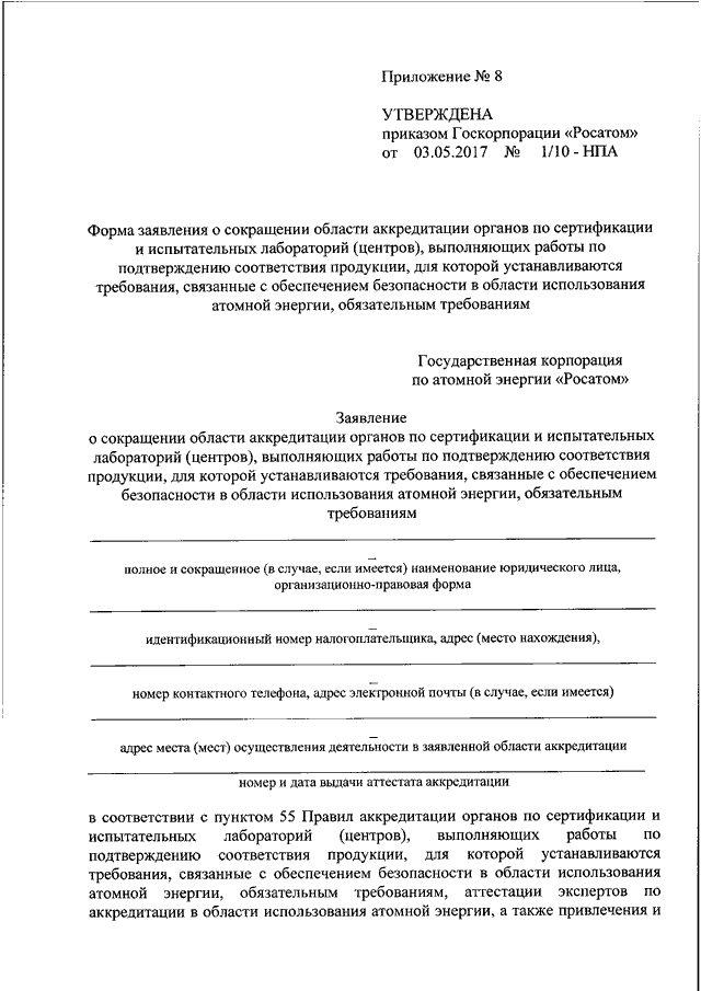 "Росатом" от 03.05.2017 N 1/10-НПА "ОБ УТВЕРЖДЕНИИ ФОРМЫ АТТЕСТАТА АККРЕДИТАЦИИ ОРГАНА ПО СЕРТИФИКАЦИИ, ИСПЫТАТЕЛЬНОЙ ЛАБОРАТОРИИ (ЦЕНТРА), ВЫПОЛНЯЮЩИХ РАБОТЫ ПО ПОДТВЕРЖДЕНИЮ СООТВЕТСТВИЯ ПРОДУКЦИИ, ДЛЯ КОТОРОЙ УСТАНАВЛИВАЮТСЯ ТРЕБОВАНИЯ, СВЯЗАННЫЕ С ОБЕСПЕЧЕНИЕМ БЕЗОПАСНОСТИ В ОБЛАСТИ ИСПОЛЬЗОВАНИЯ АТОМНОЙ ЭНЕРГИИ, ОБЯЗАТЕЛЬНЫМ ТРЕБОВАНИЯМ И ФОРМ ПРИЛОЖЕНИЙ К НЕМУ, ФОРМЫ РЕШЕНИЯ ОРГАНА ПО АККРЕДИТАЦИИ О ПРОВЕДЕНИИ ОЦЕНКИ СООТВЕТСТВИЯ ЗАЯВИТЕЛЯ КРИТЕРИЯМ АККРЕДИТАЦИИ ОРГАНОВ ПО СЕРТИФИКАЦИИ И ИСПЫТАТЕЛЬНЫХ ЛАБОРАТОРИЙ (ЦЕНТРОВ), ВЫПОЛНЯЮЩИХ РАБОТЫ ПО ПОДТВЕРЖДЕНИЮ СООТВЕТСТВИЯ ПРОДУКЦИИ, ДЛЯ КОТОРОЙ УСТАНАВЛИВАЮТСЯ ТРЕБОВАНИЯ, СВЯЗАННЫЕ С ОБЕСПЕЧЕНИЕМ БЕЗОПАСНОСТИ В ОБЛАСТИ ИСПОЛЬЗОВАНИЯ АТОМНОЙ ЭНЕРГИИ, ОБЯЗАТЕЛЬНЫМ ТРЕБОВАНИЯМ, И ФОРМ ЗАЯВЛЕНИЙ, ПОДАВАЕМЫХ ЮРИДИЧЕСКИМИ ЛИЦАМИ, ПРЕТЕНДУЮЩИМИ НА АККРЕДИТАЦИЮ В КАЧЕСТВЕ ОРГАНА ПО СЕРТИФИКАЦИИ, ИСПЫТАТЕЛЬНОЙ ЛАБОРАТОРИИ (ЦЕНТРА), И ОРГАНАМИ ПО СЕРТИФИКАЦИИ И ИСПЫТАТЕЛЬНЫМИ ЛАБОРАТОРИЯМИ (ЦЕНТРАМИ), ВЫПОЛНЯЮЩИМИ РАБОТЫ ПО ПОДТВЕРЖДЕНИЮ СООТВЕТСТВИЯ ПРОДУКЦИИ, ДЛЯ КОТОРОЙ УСТАНАВЛИВАЮТСЯ ТРЕБОВАНИЯ, СВЯЗАННЫЕ С ОБЕСПЕЧЕНИЕМ БЕЗОПАСНОСТИ В ОБЛАСТИ ИСПОЛЬЗОВАНИЯ АТОМНОЙ ЭНЕРГИИ, ОБЯЗАТЕЛЬНЫМ ТРЕБОВАНИЯМ"