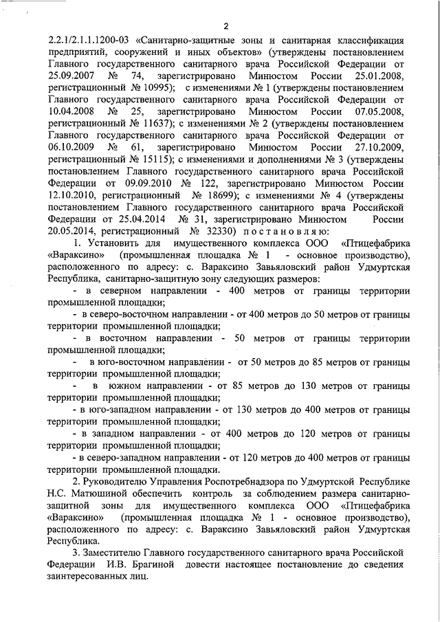 "ОБ УСТАНОВЛЕНИИ РАЗМЕРА САНИТАРНО - ЗАЩИТНОЙ ЗОНЫ ДЛЯ ИМУЩЕСТВЕННОГО КОМПЛЕКСА ООО "ПТИЦЕФАБРИКА "ВАРАКСИНО" (ПРОМЫШЛЕННАЯ ПЛОЩАДКА N 1 - ОСНОВНОЕ ПРОИЗВОДСТВО), РАСПОЛОЖЕННОГО ПО АДРЕСУ: С. ВАРАКСИНО ЗАВЬЯЛОВСКИЙ РАЙОН УДМУРТСКАЯ РЕСПУБЛИКА"